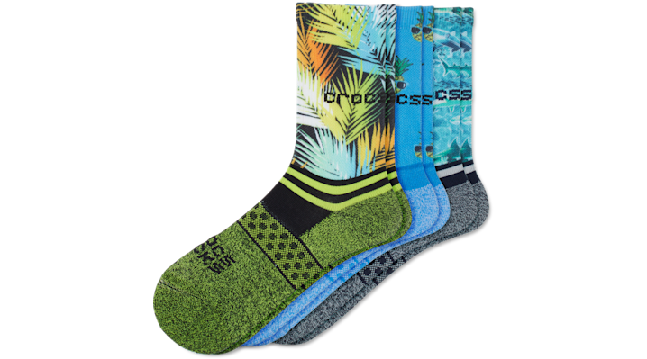 Be comfortable anywhere and everywhere in your own shoes—and now in your own Crocs Socks. Each pair has been engineered with high-quality elastic to help socks stay up, twisted and compacted yarn for improved durability, and a mesh arch band for fit and comfort. Plus, they’re a stylish addition to your everyday look whether you’re lounging or leveling up your favorite outfits. Go wild with this 3-pack by pairing them up or mixing and matching your socks style. Crocs Socks Kid Crew Boy Pool Party 3 Pack Details: 65.3% cotton, 19.3% nylon, 13.2% polyester, 2.2% elastane Machine Wash in 40 C / 104 F Avoid bleaching or ironing, tumble dry low Unique patterns and colors inspired by Crocs Classic shoes and Jibbitz™ charms Available in a variety of low, crew and quarter heights Includes three matching pairs