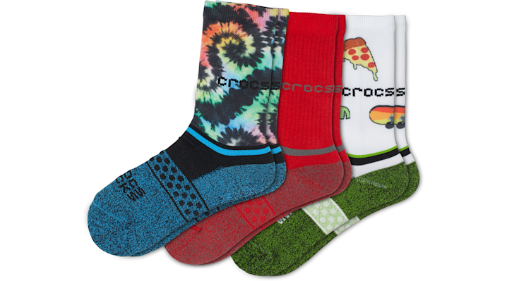 Be comfortable anywhere and everywhere in your own shoes—and now in your own Crocs Socks. Each pair has been engineered with high-quality elastic to help socks stay up, twisted and compacted yarn for improved durability, and a mesh arch band for fit and comfort. Plus, they’re a stylish addition to your everyday look whether you’re lounging or leveling up your favorite outfits. Go wild with this 3-pack by pairing them up or mixing and matching your socks style. 65.3% cotton, 19.3% nylon, 13.2% polyester, 2.2% elastane Machine Wash in 40 C / 104 F Do not bleach or iron. Tumble dry on low Unique patterns and colors inspired by Crocs Classic shoes and Jibbitz™ charms