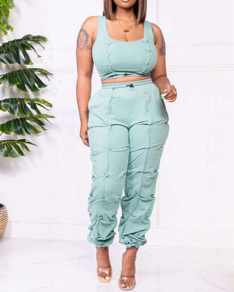 Crop Tank Top & Drawstring Ruched Pants Set, Lighted blue