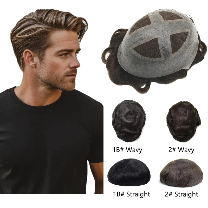 Cross Over PU Model Men Toupee Human Hair | Lace+PU Combination, High Density Hair Replacement System
