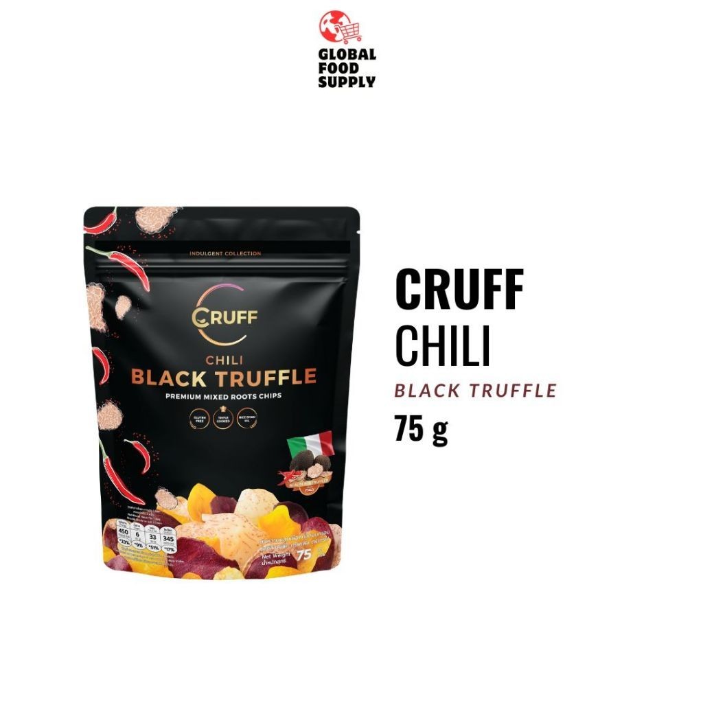 CRUFF BLACK TRUFFLE memberikan perpaduan antara warna warni ubi yang alami & krispi dengan Jamur Truffle Hitam dari Italia yang harum & gurih membuat setiap momen harimu semakin berwarna dan spesial!