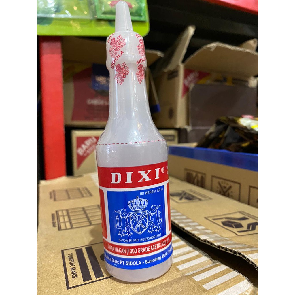 DIXI Makan Cuka 150 mL merupakan asam cuka atau asam asetat (acetic acid) dengan senyawa kimia organik yang dikenal sebagai pemberi rasa asam dan aroma dalam makanan, serta dapat berfungsi sebagai pengawet bahan makanan.