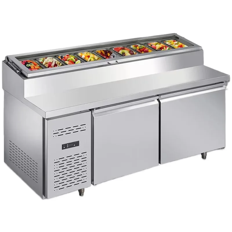 Customize Stainless Steel Refrigeration Equipment Slotted Pizza Spreading Table with Small Seasoning Boxes