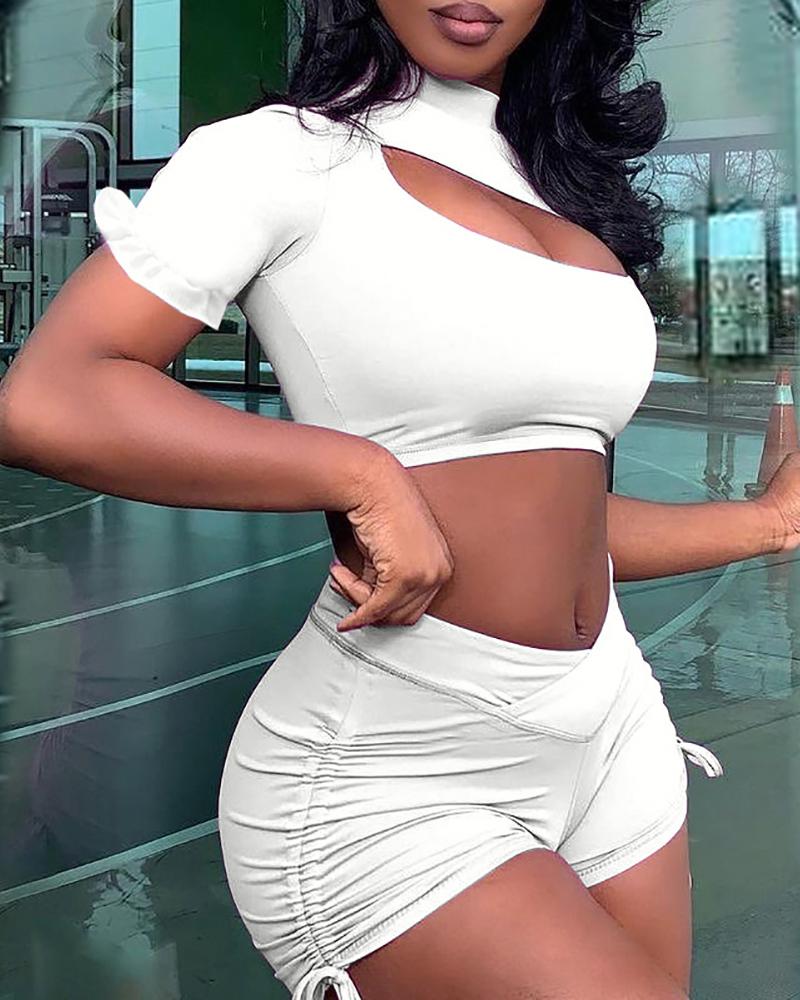 Cutout Ruffles Crop Top & Ruched Drawstring Shorts Set, White