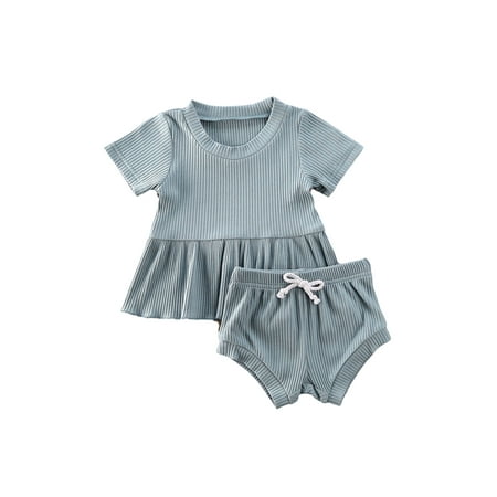 Canrulo Infant Baby Girls Summer Clothes Ruffle Short Sleeve T-Shirt Tops Shorts Pants 2PCS Casual Outfits Blue 0-6 Months