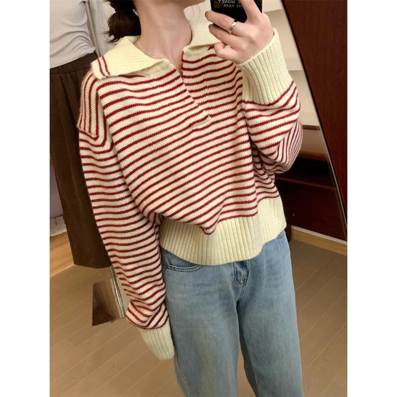 DAFIFY Женская мода повседневная осень-зима полосатый принт длинный рукав поло воротник свитера Size: One Size красный