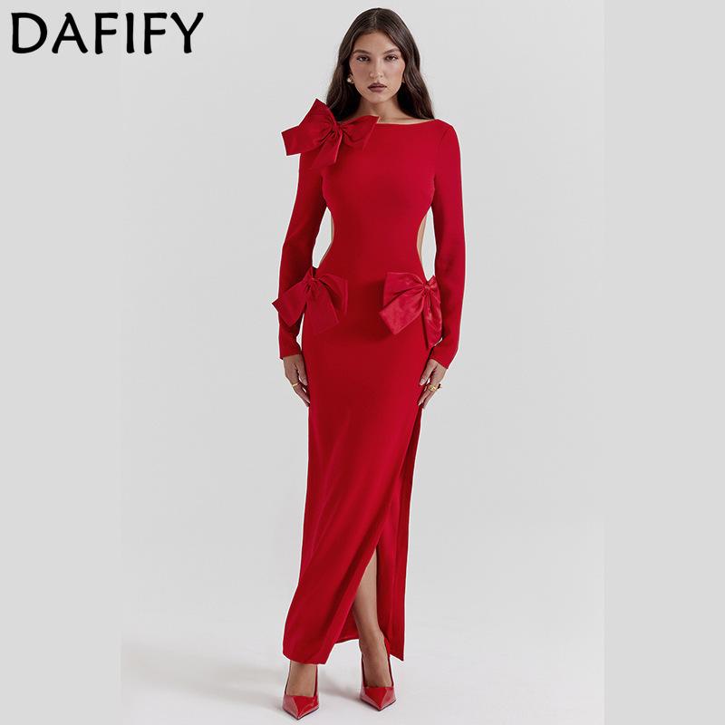 DAFIFY Женские модные весенне-осенние однотонные коктейльные и вечерние платья с длинным рукавом и круглым вырезом с высокой талией