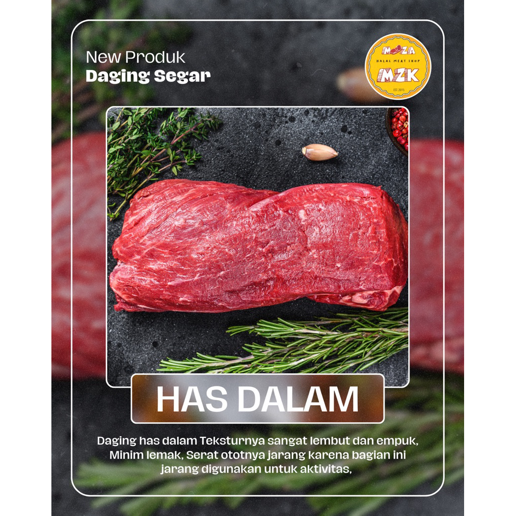Daging sapi has dalam adalah bagian daging sapi yang berasal dari bagian dalam pinggang (loin) tepatnya di bagian otot yang jarang digunakan, sehingga teksturnya sangat empuk dan lembut serta Teksturnya sangat halus dan mudah dipotong.