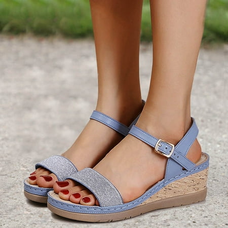 〖Yilirongyumm〗 Blue 40 Sandals Women Solid Shoes Platform Wedge Roman Frosted Glitter Sandals Color Buckle Women s Women s Sandals
