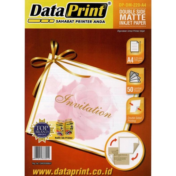 DataPrint Double Side Matte 220 gsm A4 adalah kertas dengan permukaan yang kesat atau tidak mengkilap dan dapat dicetak di kedua sisinya.