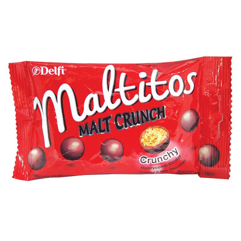 Delfi Maltitos Malt Crunch 45g merupakan produk cokelat Delfi Indonesia yang dipersembahkan untuk menemani kamu yang senang menikmati cokelat di sela waktu bekerja atau waktu luang. Cokelat Delfi ini berbeda dengan cokelat Delfi lainnya. Delfi Chocolate Maltitos Malt Crunch berbentuk bola-bola cokelat berisi kembang gula dengan malt atau gandum dengan cita rasa premium yang lezat. Dilapisi lapisan cokelat lembut yang membuat tekstur cokelat Delfi ini lebih lembut dan gurih ketika dikunyah. Dikemas dalam bungkusan plastik dan dirancang dalam bentuk yang sederhana, membuat kamu dapat menikmatinya kapanpun dan di manapun kamu mau. Kamu juga dapat menikmatinya bersama teh, susu, atau kopi kesukaanmu atau dijadikan campuran makanan lain."