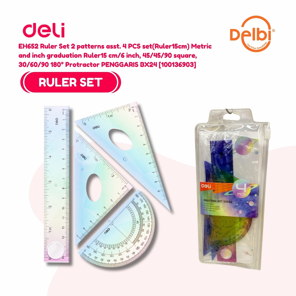 DELI EH652 Ruler Set 2 patterns asst. 4 PCS set(Ruler15cm) Metric and inch graduation Ruler15 cm/6 inch, 45/45/90 square, 30/60/90 180° Protractor PENGGARIS BX24