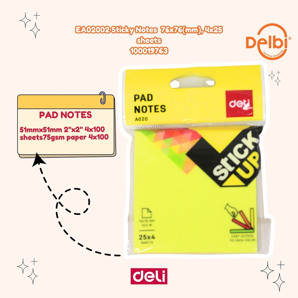 DELI EA02002 Sticky Notes 76x76(mm), 4x25 sheets BX12