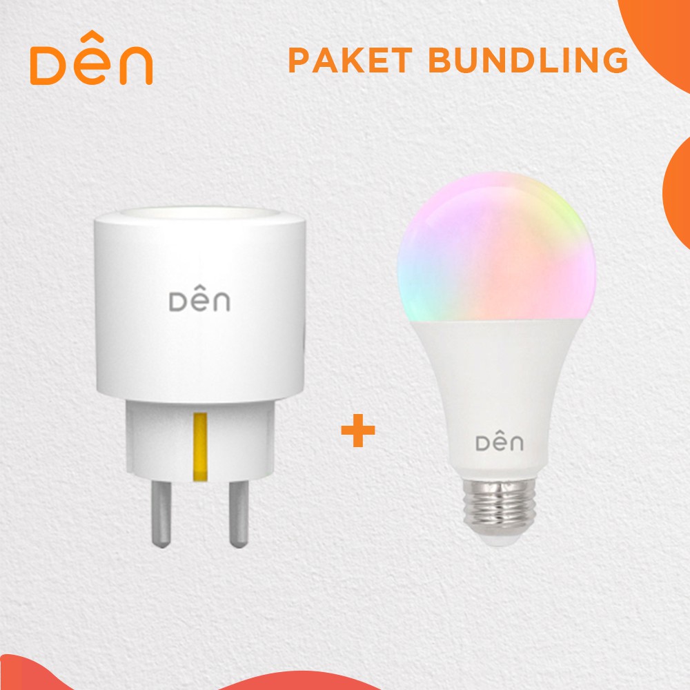 DEN Smart Home Socket/Plug + Smart Bulb BundledPaket hemat produk Den Smart Home untuk ciptakan rumah pintarmu yang dapat dikontrol dari mana saja selama terkoneksi dengan internetIsi Paket :1 pcs DEN Smart Home WiFi Socket / Plug with Power Monitoringhttps://shopee.co.id/product/206038501/7010134524/1 pcs DEN Smart Home WiFi Light Bulb 12W - Bohlam LED (RGB + CCT)https://shopee.co.id/product/206038501/5943565796/