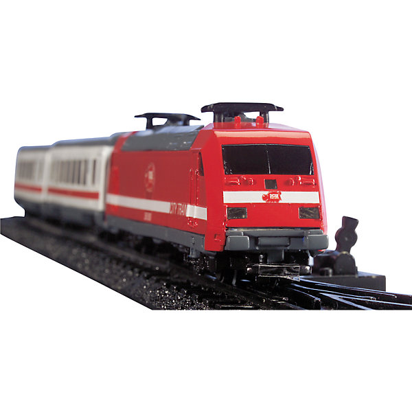 Состав: локомотив (20 см), двигается назад и вперед, оснащен звуковой и световой функциями; два пассажирских вагона (по 19 см), 2 прямые линии рельсов (21 см), 10 изогнутых линий рельсов, 1 переезд на линию вправо, 1 переезд на линию влево.