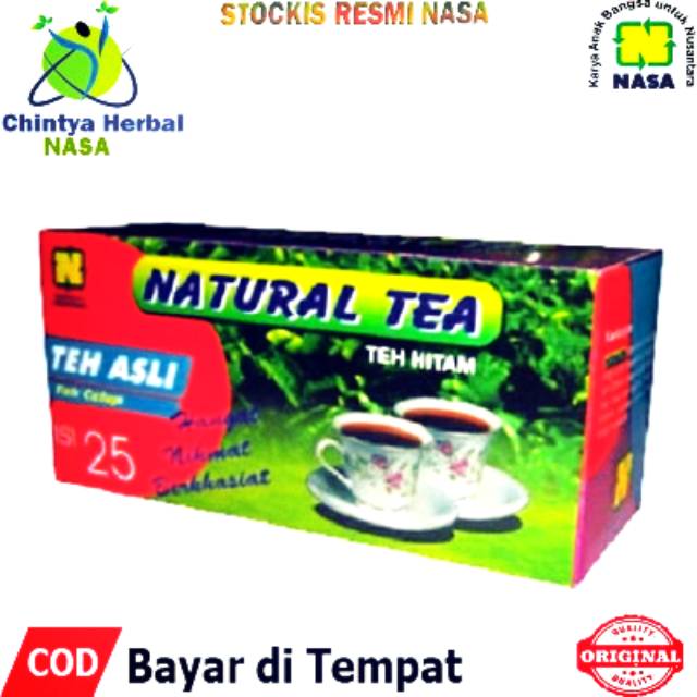 Natural Teh Celup Asli Nasa, Natural Tea merupakan teh bermutu tinggi yang mengandung Teaflavin dan Cathecin, sangat berkhasiat bagi kesehatan gigi dan gusi, serta memiliki kandungan anti oksidan, menekan tingkat serangan jantung, darah tinggi, dan lain-lain. Gambar Natural Tea - Teh Hitam Celup Alami NasaManfaat Natural Teh Celup Nasa Natural Tea persembahan khas PT Natural Nusantara, disamping rasa dan aroma yang khas, juga memiliki segi manfaat khususnya dalam hal kesehatan tubuh yang cukup besar peranannya. Dengan minum Natural Teh Celup ini secara rutin dapat membantu mencegah penimbunan kolesterol pada pembuluh darah arteri, terutama pada wanita. CARA PENYAJIAN NATURAL TEA Masukan teh celup Natural Tea kedalam cangkir atau teko. Tuangkan air mendidih kedalam cangkir atau teko. Naikan dan turunkan Natural Tea untuk mendapatkan kepekatan, rasa seta keharuman yang mantap. Natural Tea siap disajikan catatan: 1 sachet Natural Teh Celup bisa untuk kurang lebih 4 gelas / 6-7 cangkir. Nikmati Teh Hitam Natural Tea istimewa ini di suasana hangat anda. Dapatkan kehangatan Natural Teh Celup ini hanya di Distributor Nasa!