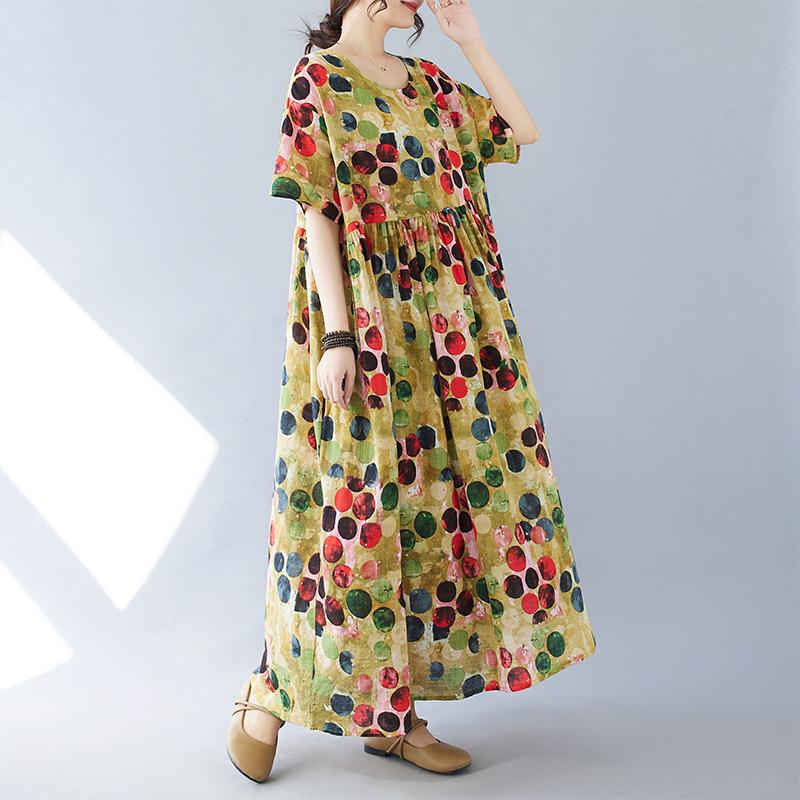DIMANAF Женское платье больших размеров 2024, новое летнее стильное платье с круглым вырезом и цветочным принтом, зеленое льняное базовое платье 1092 One Size