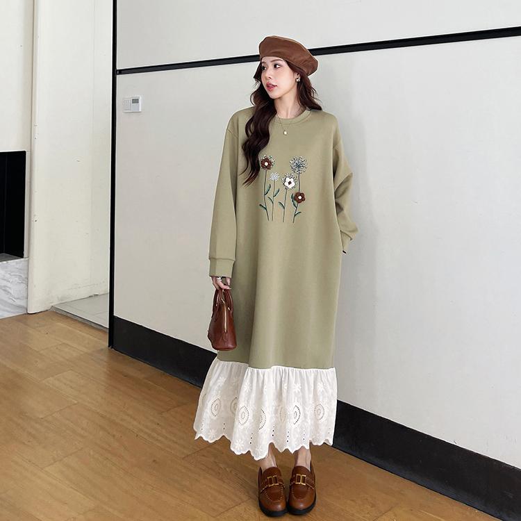 DIMANAF Женское платье 2024 года, новое осеннее платье большого размера с круглым вырезом, однотонное платье с длинным рукавом, базовые платья свободного покроя L зелёный