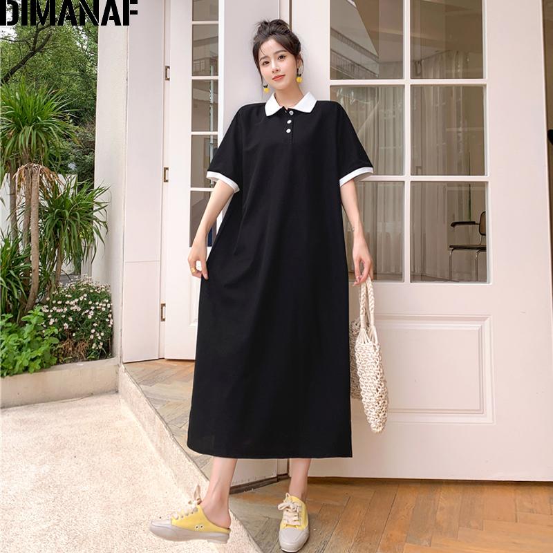 DIMANAF Лето плюс размер женское элегантное черное хлопковое длинное платье-рубашка Свободная повседневная одежда больших размеров