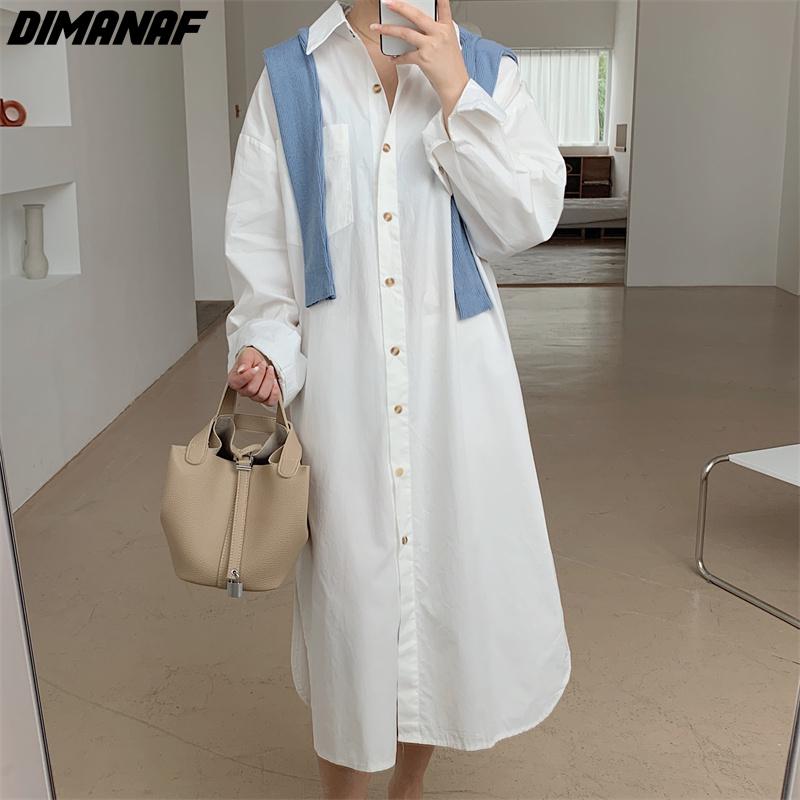 DIMANAF 2021 Новая летняя рубашка Платье Женщины Плюс Размер Сарафан Хлопок Твердое платье Элегантная леди Повседневная Свободная Одежда Оверсайз