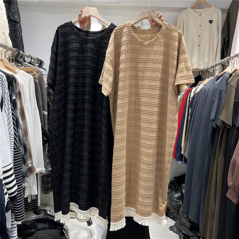DIMANAF 2023 Женщины Лето Гонконг Стиль Ретро Трикотаж Кисточка Длина до колена Платье с короткими рукавами Средняя длина Тонкая А-силуэта Длинная юбка