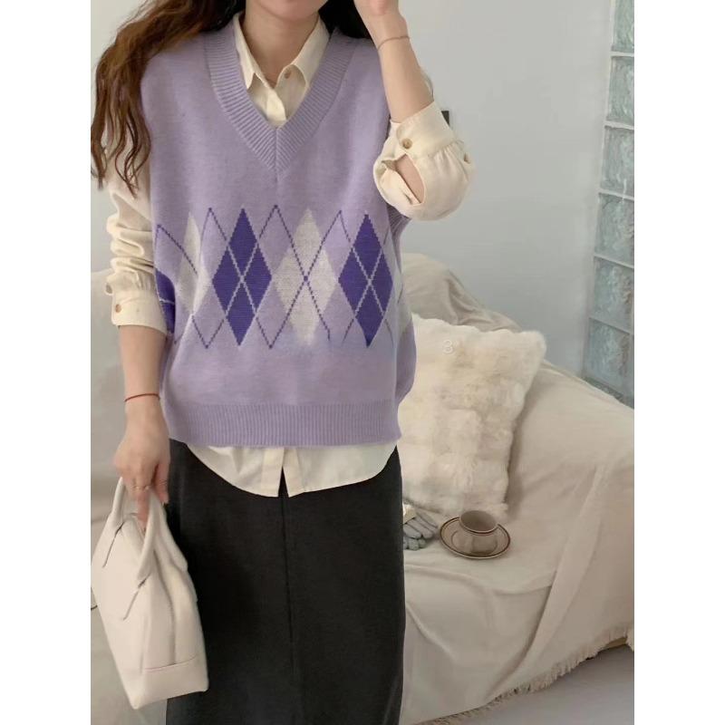 DIMANAF 2023 Жилет больших размеров Большой размер Осенние Женские Клетчатые Свитера Принт Вязание Мода Оверсайз Фиолетовый Базовый Базовый Повседневный Стиль Свободный Свитер