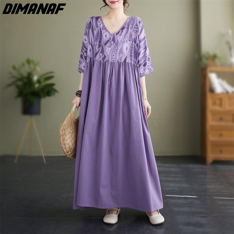 DIMANAF 2023, летнее платье-футболка больших размеров, женское свободное платье в стиле пэчворк с принтом, винтажные повседневные платья с v-образным вырезом, женское