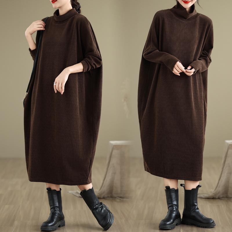 DIMANAF 2024 Осеннее платье Женское однотонное свитер Свободное повседневное элегантное длинное платье макси с длинным рукавом Плюс Размер One Size коричневый