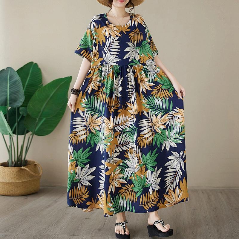 DIMANAF 2024 Платье больших размеров, женское летнее платье с круглым вырезом, богемный свободный макси-платье большого размера с цветочным принтом 9006 One Size зелёный