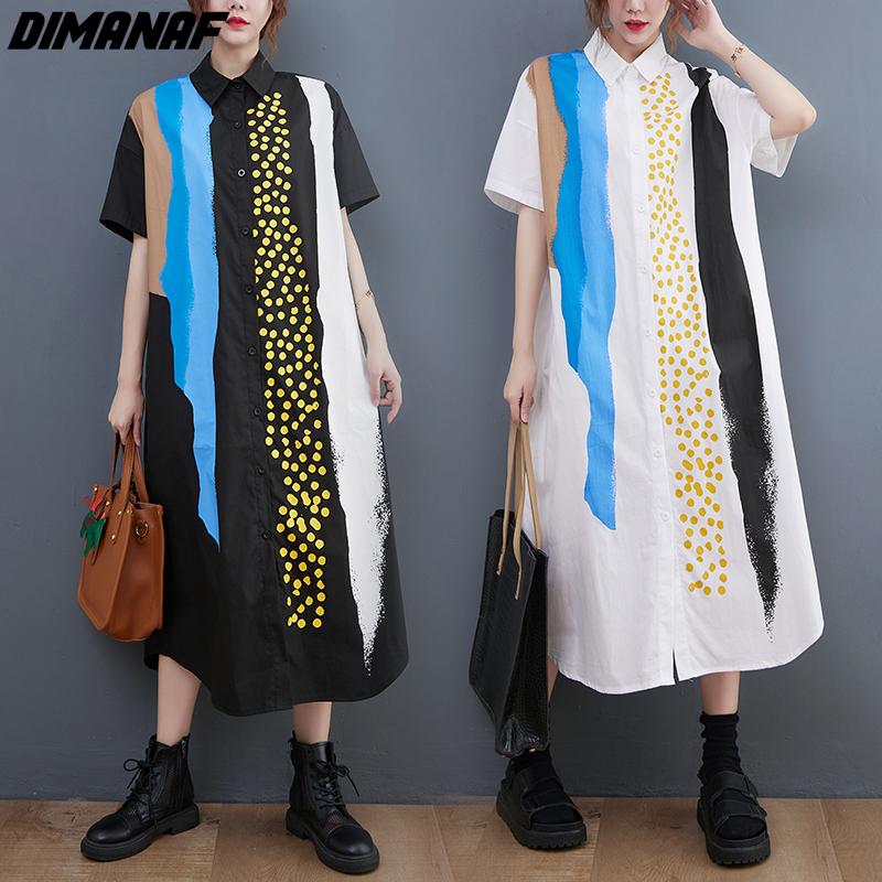 DIMANAF 2024, летняя рубашка больших размеров, длинное платье, хлопковая женская свободная повседневная футболка с принтом на пуговицах, женские винтажные платья с принтом