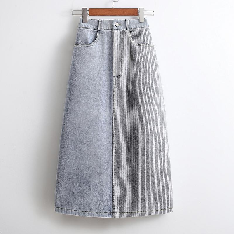DIMANAF 2025 Летние джинсовые юбки больших размеров Женские А-силуэта Модные свободные юбки в полоску с лоскутной отделкой Высокая талия Винтажные макси L синий