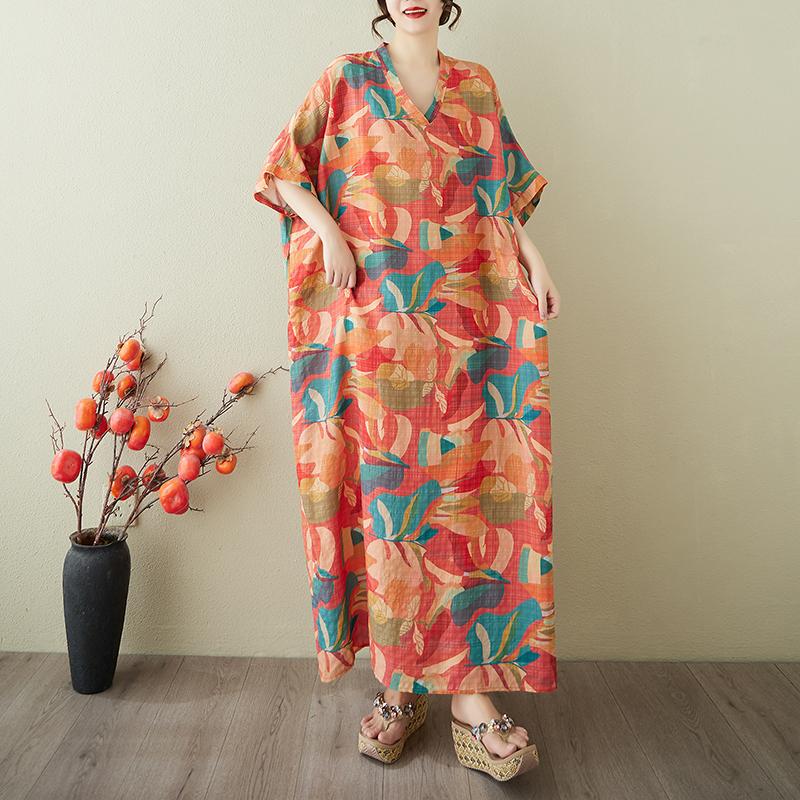 DIMANAF 2025 Лето Большой Размер Новое Платье Женщины Винтажное Длинное Повседневное Свободное Базовое Платье Макси с Принтом и V-образным Вырезом One Size