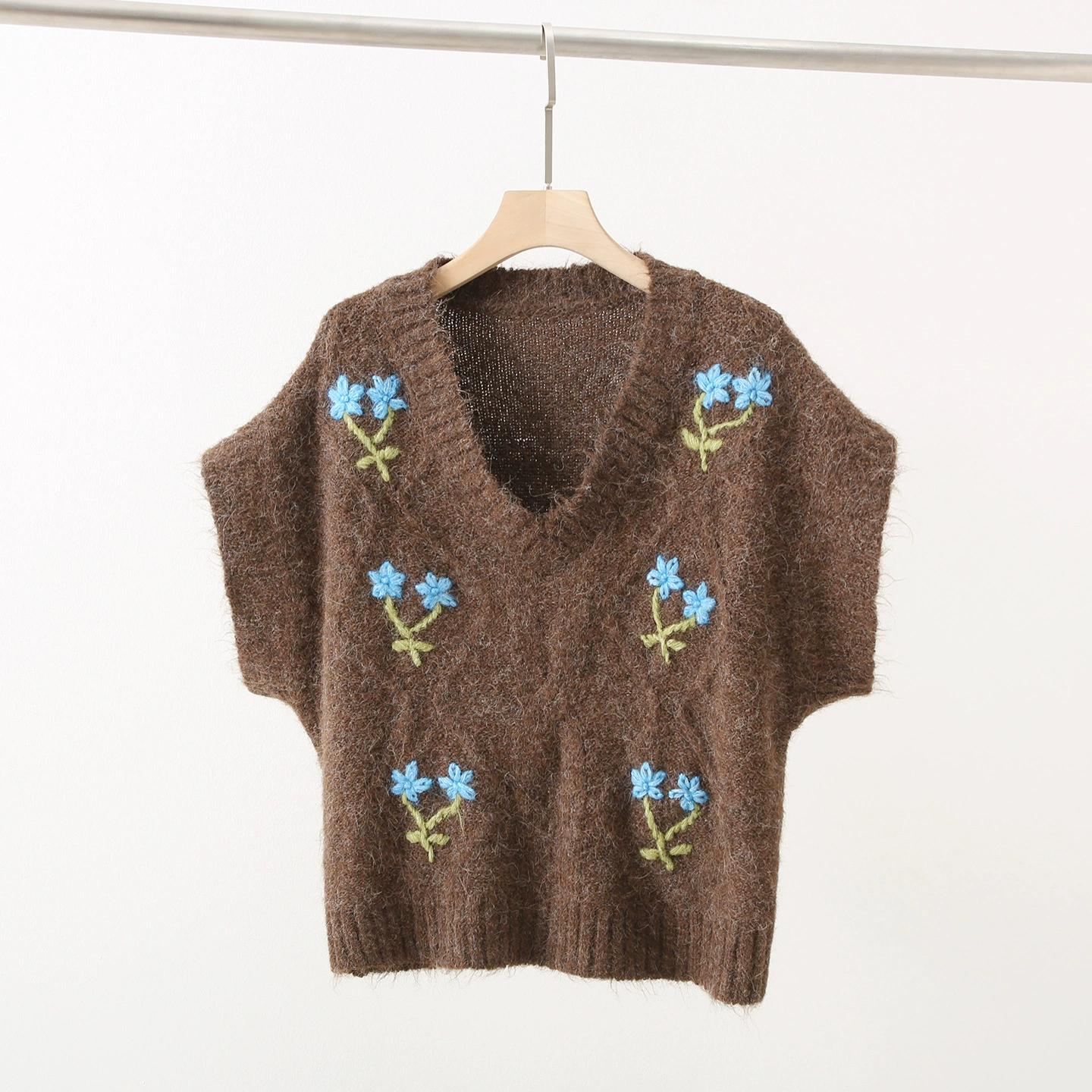 DIMANAF 2025 Осень Женский Жилет Летучая мышь Свитера Вышитые Цветы Вязание Пуговицы Повседневный Стиль Свободный Свитер One size
