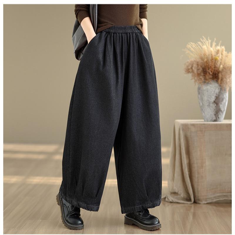 DIMANAF 2025 Осень Зима Большой Размер Джинсы Утепленные Флисом Новые Женские Винтажные Хлопковые Джинсовые Длинные Брюки 2XL чёрный