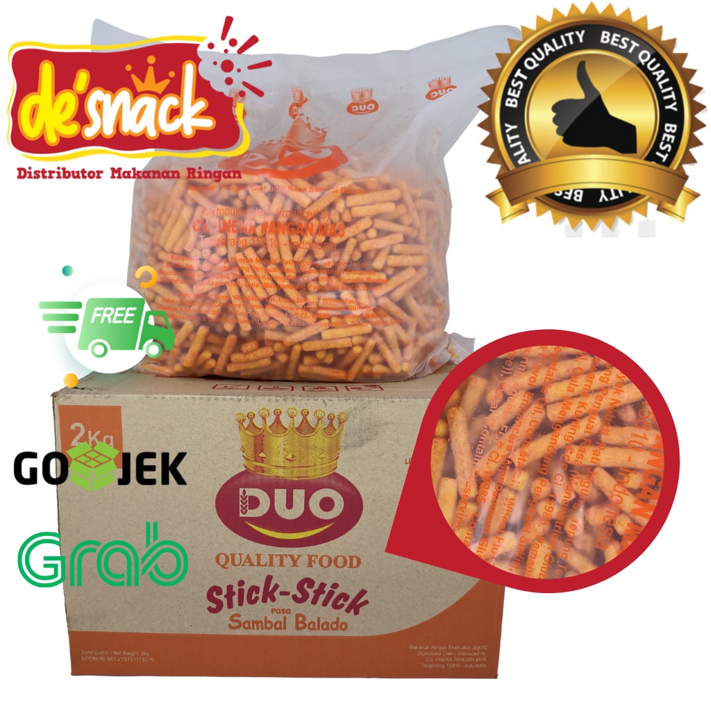 Distributor/Grosir/Snack/Cemilan STICK STICK RASA SAMBAL BALADO Merk DUO dengan kemasan 2 Kg dijual dengan harga grosir pabrik yang dapat dijual lagi dengan keuntungan yang menarik, bisa dikemas lagi dengan ukuran dan merek sendiri