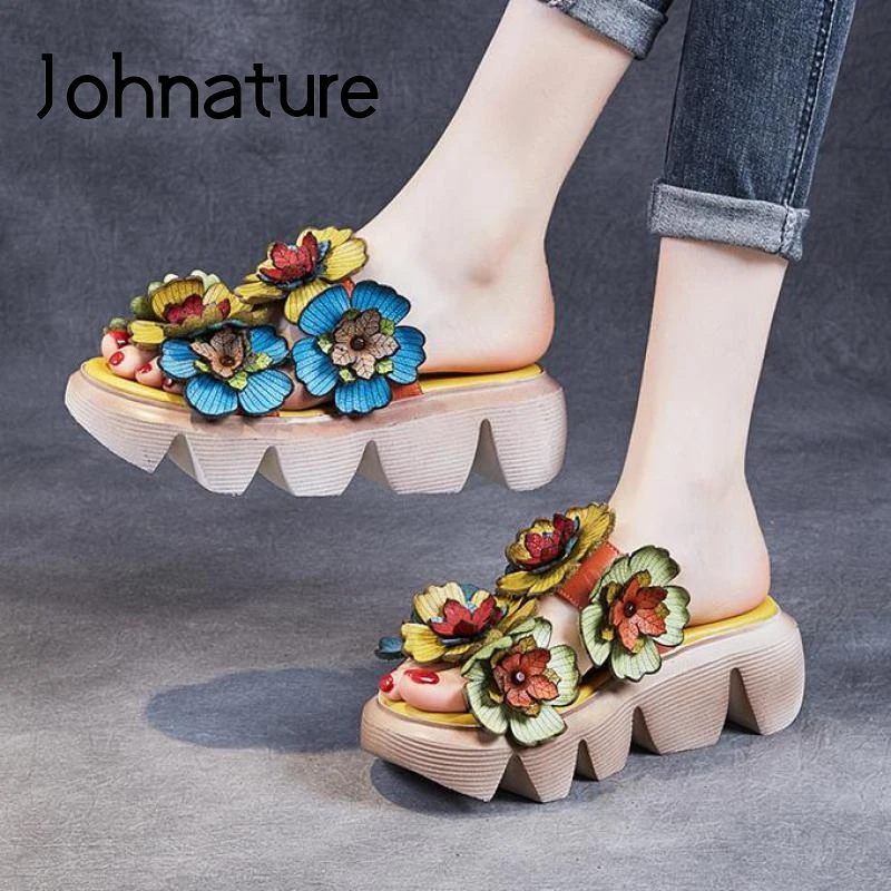 Johnature Genuine Leather Floral Shoes Women Slippers Summer 2022 New Outside Slides Wedges Sewing Leisure Ladies Slippers