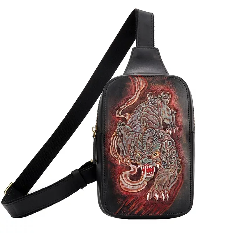 100% Handmade Engraved Brave troops Designer Genuine Leather Men's Small Chest Bag Vintage Messenger Bag Man Cross Shoulder Bag