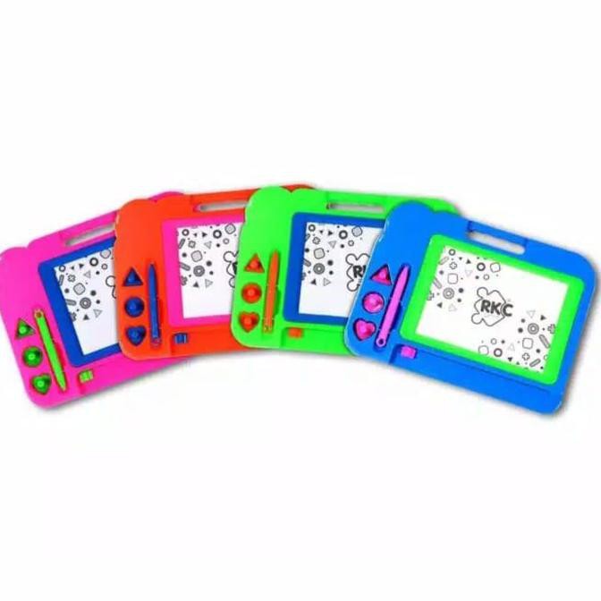 terdiri dari papan tulis magnet hapus, Pena magnet/tanpa tinta, cetakan/stempel berbentuk hati, segitiga, dan lingkaran. bagus utk melatih kreatifitas anak Dan tidak mengotori lingkaran.