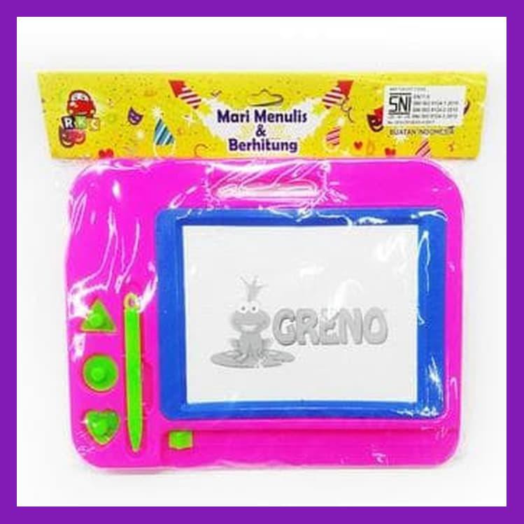 terdiri dari papan tulis magnet hapus, Pena magnet/tanpa tinta, cetakan/stempel berbentuk hati, segitiga, dan lingkaran. bagus utk melatih kreatifitas anak Dan tidak mengotori lingkaran.