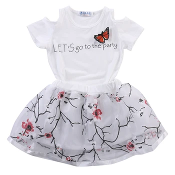 Kids Girls Summer Short Sleeve Suit Lovely Letter Print White Round Neck T-shirt Color Bow Lace Skirt Fashion Two Piece Set