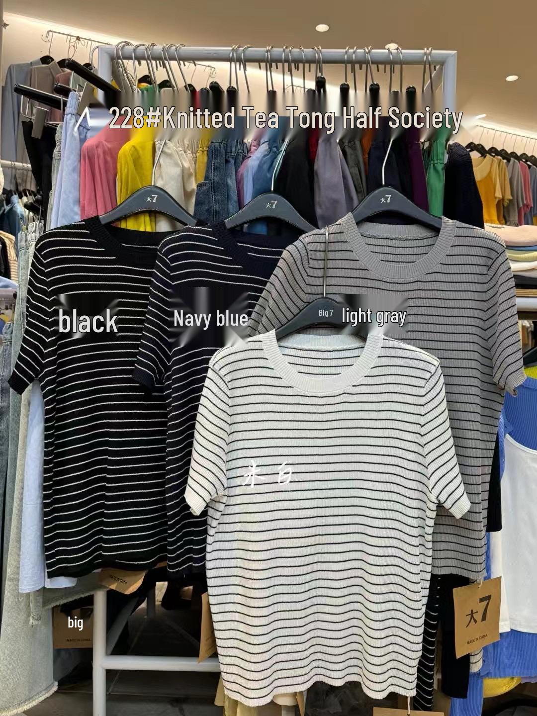 Da7 Женская повседневная трикотажная футболка в полоску большого размера - Корейский стиль, Короткий рукав, Летняя ретро One Size грязно-белый
