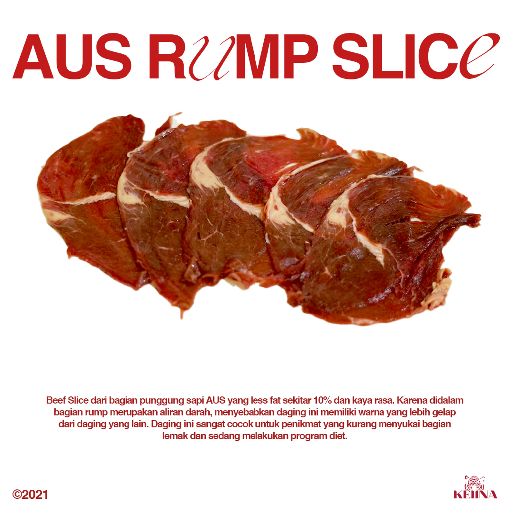 Beef Slice dari bagian punggung sapi AUS yang less fat sekitar 10% dan kaya rasa. Karena di bagian rump banyak aliran darah, menyebabkan daging ini memiliki warna yang lebih gelap dari daging yang lain. Daging ini cocok buat yang kurang suka lemak dan sedang melakukan program diet.