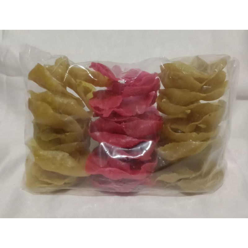 Kerupuk berbentuk bunga ros dengan bahan dasar tepung beras dan ketan.