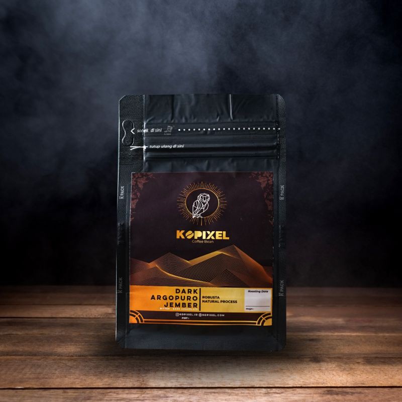 Dark Argopuro Jember ini adalah kopi jenis robusta yang diolah sampai menjadi biji kopi pilihan dan diproses sampai memiliki kualitas terbaik. Berasal dari lereng Pegunungan Argopuro di Kab. Jember, Jawa Timur.