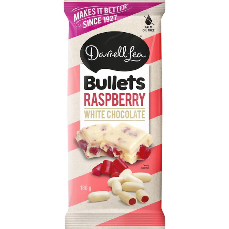 Darrell Lea makes it better. Better chocolate has to mean better for everyone. That's why we're proud to tell you that Darrell Lea is 100% Palm Oil Free, 100% Australian Made and uses 100% sustainably sourced cocoa in all our chocolate! Creamy White Chcoolate with chewy raspberry pieces & crunchy raspberry chips.