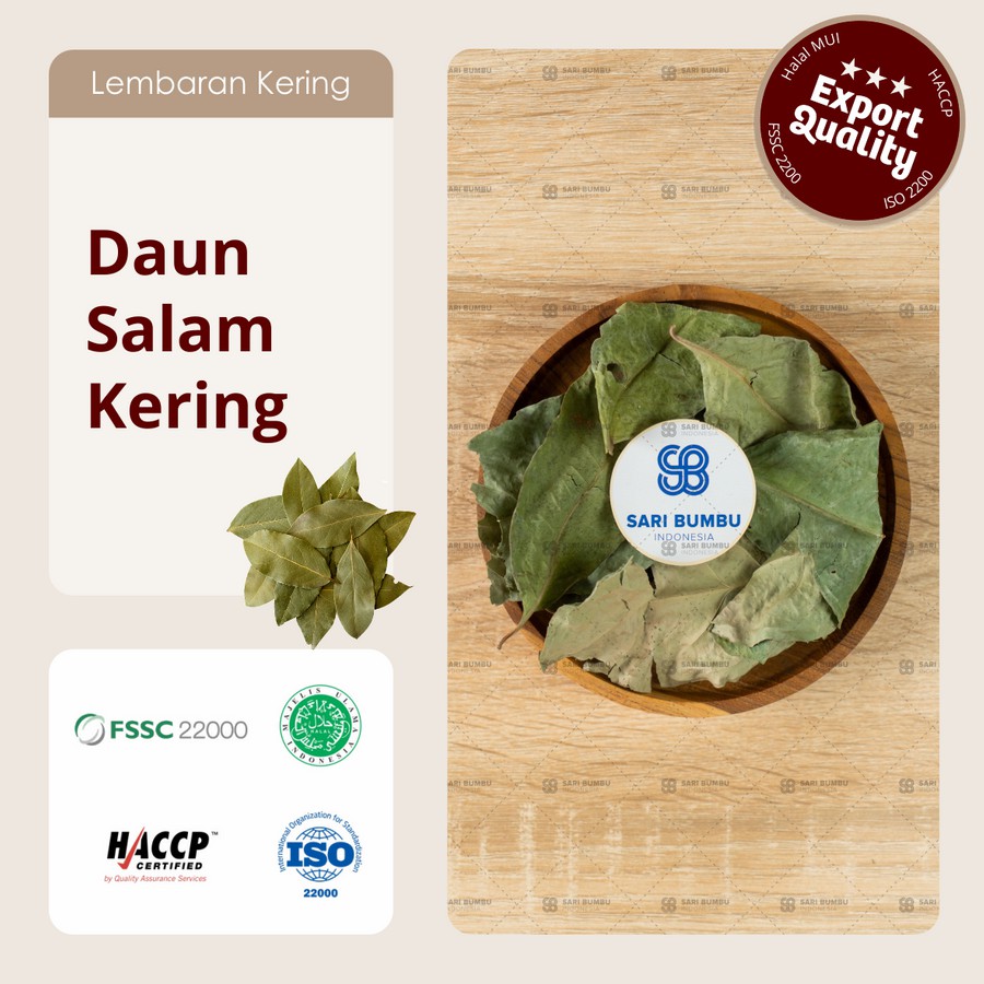Daun salam merupakan salah satu bumbu masakan yang sering digunakan dan cukup penting dalam kontribusi rasa dalam masakan. Tapi menyimpan daun salam agak sulit ya karena cepat layu atau berubah menjadi hitam. Daun salam kering ini adalah alternatif untuk menyimpan dalam waktu lama, produk ini bisa disimpan sampai jangka waktu yang cukup lama ya, asal penyimpanannya terjaga di tempat yang kering dan terhindar dari sinar matahari