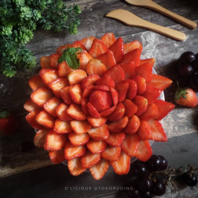 Puding dengan dekorasi buah Strawberry yg ditata sedemikian hingga menjadi seperti bunga merah yg sedang mekar