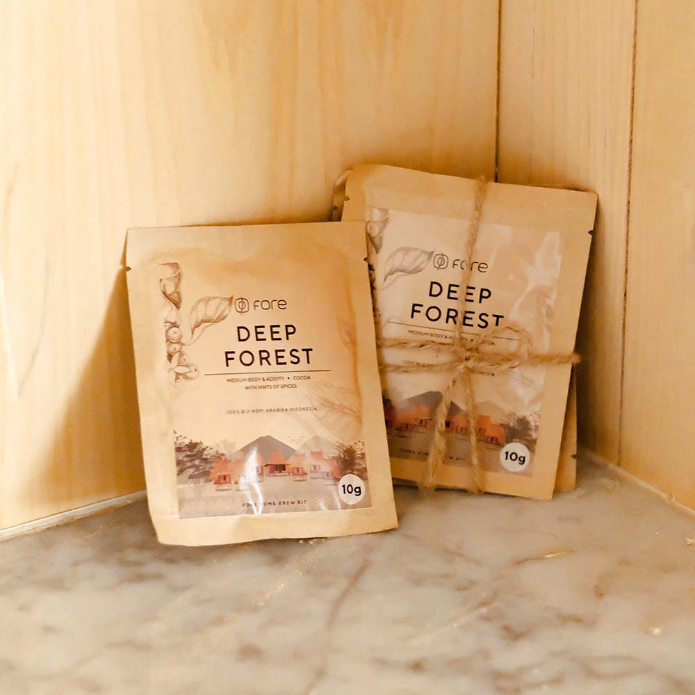Paket kopi Deep Forest 100% Arabica Coffee yang sudah digiling dan siap minum.