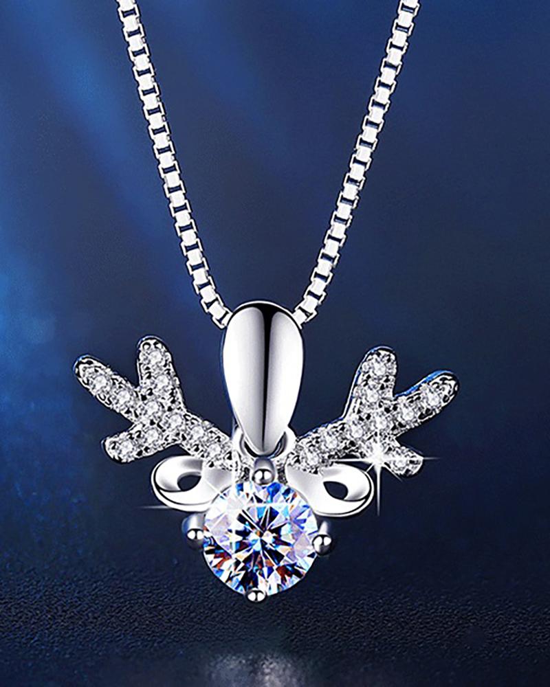 Deer Pattern Rhinestone Decor Charm Necklace, Silver