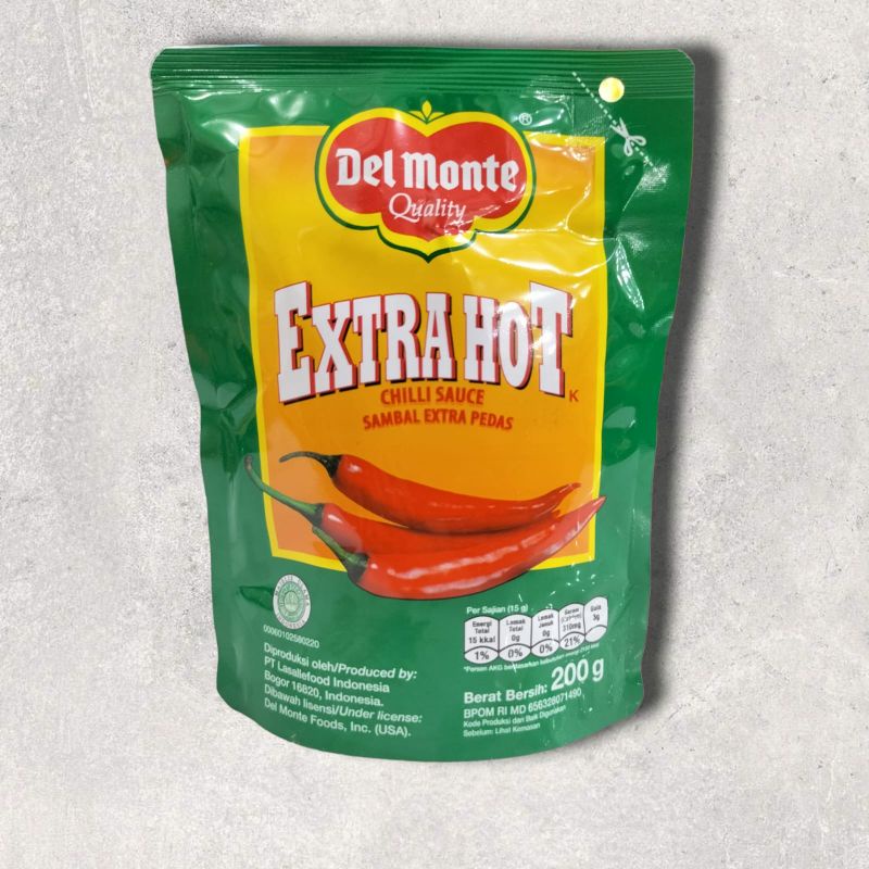 DELMONTE CHILI EXTRA HOT POUCH 1KG Merupakan Saus Sambal yang dibuat dengan cabe pilihan yang lezat sehingga menghasilkan rasa pedas yang menggugah selera Anda. Dihasilkan dari bahan-bahan alami berkualitas sehingga menghasilkan cita rasa yang khas, lezat, dan pedas yang terasa. Rasa pedas yang dihadirkan dalam Del Monte ini adalah cita rasa pedas yang hot. Kelezatan yang berlipat akan menemani hari-hari Anda.